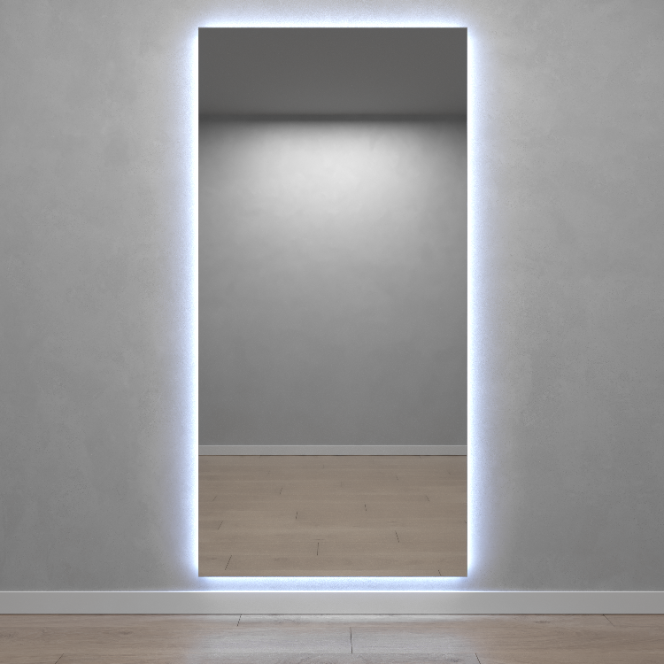Безрамное зеркало прямоугольной формы с контурной (тыльной) холодной подсветкой, свет 6000К. Подложка из высококачественного алюминия, светодиодная лента защищена матовым свето-рассеивателем от попадания пыли и влаги. Есть вывод 220W для подключения к сети, включение подсветки от выключателя на стене, либо от розетки. Возможно установить сенсорную кнопку на заказ в любом месте зеркала.